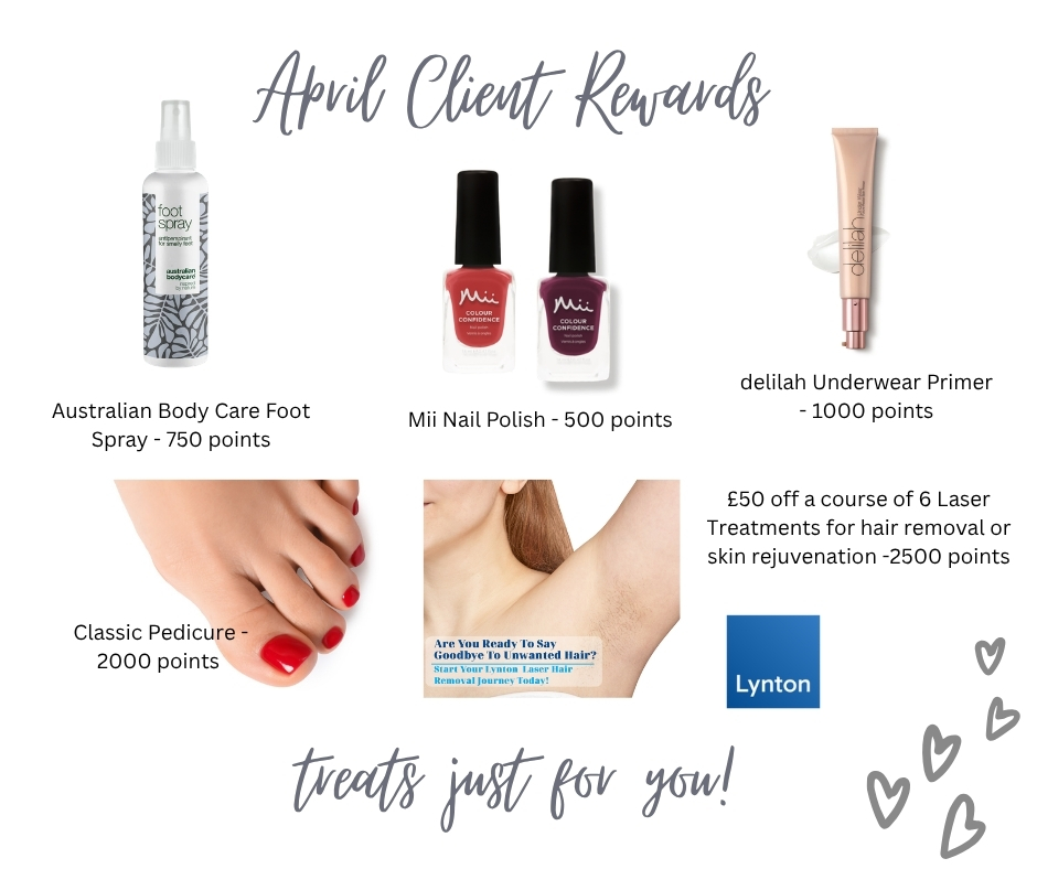 We offer a client loyalty programme for clients to accrue points and exchange them in for products, gifts, and treatments. The rewards change every month which means you only need to exchange your points when you see something you like!